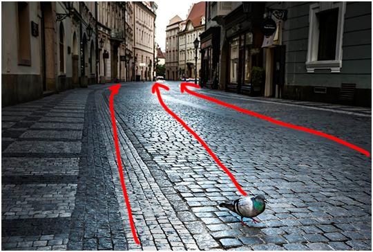 这张图是布拉格阿的一个早晨,大概是早上五点多钟,路上很安静,天开始蒙蒙亮,我就拍了一张很安静的街道,首先看到的兴趣点是一只鸽子。路面形成的引导线以及通过路面反光形成的引导线来达到的,把目光从这只鸽子引向远方。