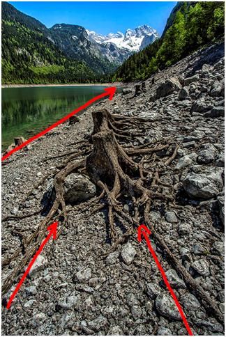 这个片子的兴趣点是树桩,树桩根系和湖岸形成的引导线,把我们的目光从树桩根系一直在往前推,一点点推到雪山,并不是跳跃性的看到雪山。观者进入画面是一个逐步的过程,是一直有引导线引导着你,最后看向了远处的森林和雪山。