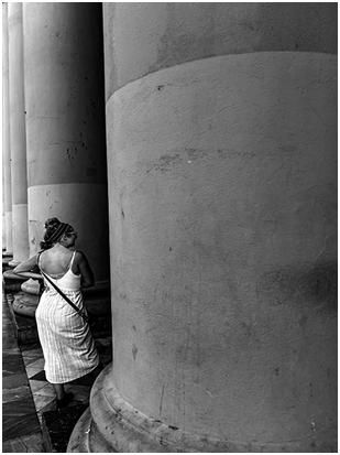 第一张图也是在街上拍的,女人肯定在与柱子后面的人在交流,是什么样的人?他们在做什么?其实都留给了观者,这就属于开放式构图。
