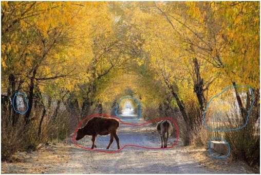 这幅片子用蓝色部分标注出来的地方,都是相对比较亮的有高光的地方,它们对照片中的主体(圈起的红色部分),两只牛形成了干扰,使得观看者的目光不能集中在主体身上,总是被这几个蓝色高光部分所吸引。