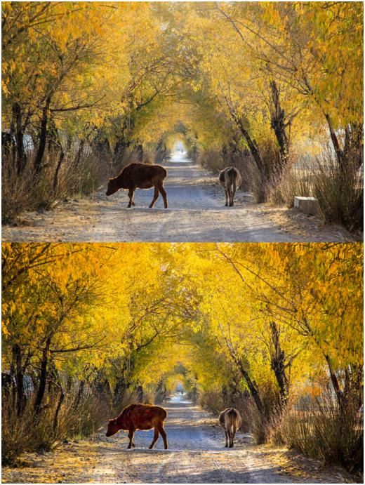 我们将远处部分的高光压低,提亮了一下黄色的树叶和地面的光照,加强了地面的阴影,这样就有了一个比较通透明快的感觉,空间的纵深效果也有了加强。另外也稍微提亮了牛身上的亮度,但不能提的太亮,因为这样的话会使片子的噪点比较大,同时也会失色。
