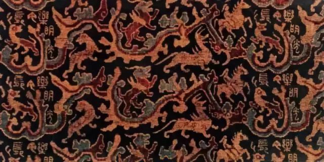 民族锦一般采用多色彩条嵌入金银丝织成,多用于民族服饰,故名。其特点是锦面上的图案从经纬线交织中显现出自然光彩,富有光泽。常见的图案有团花、葵花、“万”字“寿”字等。彩晕锦的特点是织纹华贵相映,明暗匹配,层次分明,并以色晕过渡,花纹绚丽多彩,别具一格。
