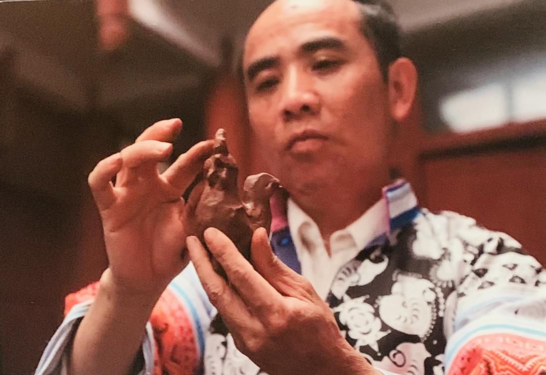 黄平县旧州镇泥哨传承人陈应坤在制作泥哨(许觊佳摄于贵州省博物馆)