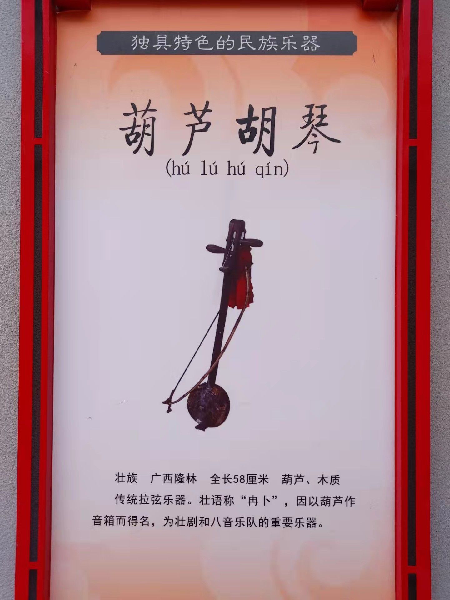 传统拉弦乐器。壮语称“冉卜”,因以葫芦作音箱而得名,为壮剧和八音乐队的重要乐器。