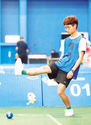 江西队选手在混合双蹴比赛中起脚击球 何五昌摄