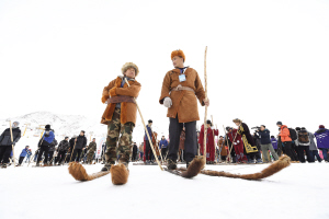 迎接完成阿尔泰山300公里滑雪穿行的9位勇士,是此次活动的重要环节。1月5日,阿尔泰山区的9位牧民,踩着传统的毛皮滑雪板,从阿勒泰地区哈巴河县铁热克提乡白哈巴村出发,历时11天,抵达阿勒泰市将军山滑雪场,完成了穿越阿尔泰山的挑战。