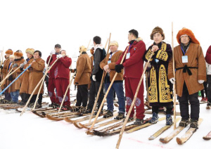 在今年的庆祝活动上,当地好客的各族群众身着传统服饰,载歌载舞。手拿单杖、脚踏毛皮滑雪板的小伙儿,与脚踩现代雪板、手持双杖的小伙儿并排站立,分外抢眼。
