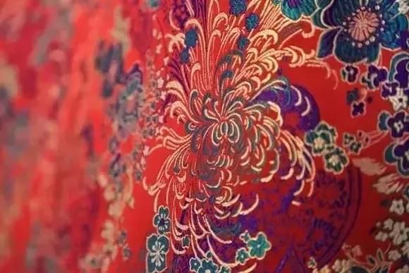 南京云锦大量使用金线,逐花异色,质地坚实,花纹浑厚优美,色彩浓艳庄重。配色运用 “色晕 ”层层推出主花,且从云锦的不同角度观察,绣品上花卉的色彩是不同的。