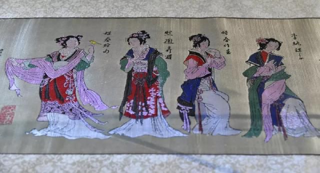 取材于唐代画家张萱的画作《虢国夫人游春图》和《簪花仕女图》,作品采用横织竖裱的方式呈现。