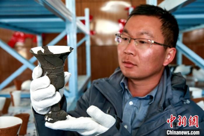 考古人员展示新发掘出土的“蛋壳陶杯” 杨东 摄