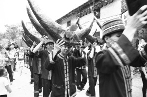 据悉,有300多年历史的杨溪古村现居住着200余户共900余名村民,该村保存完整的岭南特色古民居有28座200余间,是恭城县境内保存较为完好的古建筑群之一。图为祭牛王大典活动现场。