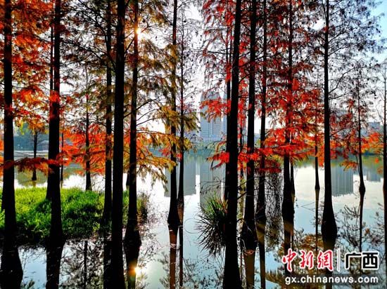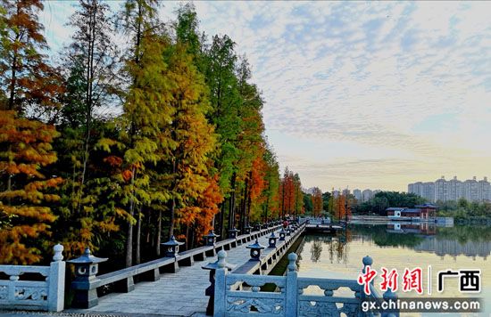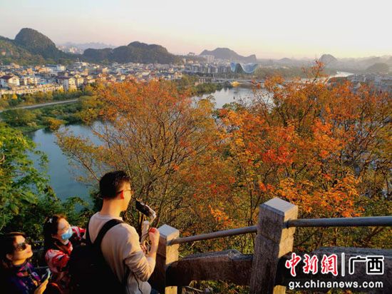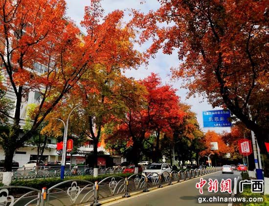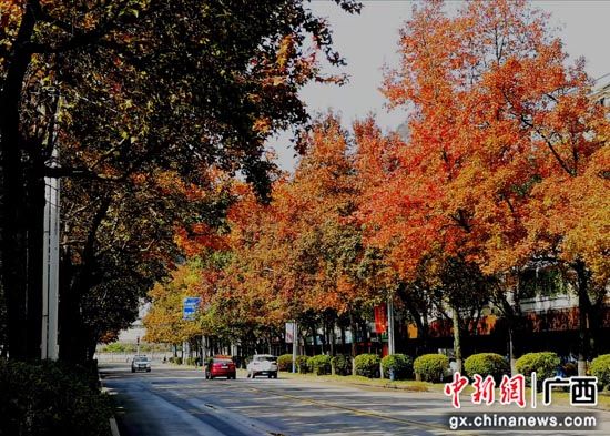 近期,广西桂林市天气逐渐降温,市区种植的10多个品种数万株色叶树的叶子逐渐变色,纷纷换上炫美的“冬装”——那火红的枫香、红枫,紫红的乌桕,金黄的银杏、栾树,灿黄的翅荚香槐、水杉,五颜六色的紫薇、樱花、梨树、李树、柿子树、小果化香、黄连木、红背山麻杆、漆树、盐肤木、苦楝树、梧桐树等,把城市装扮得五彩斑斓,为冬日里的桂林增添了一抹暖色。