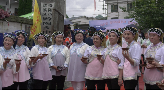 布依族青年们抬着族中神物铜鼓,吹着长长的号角,脸上满是对民族节日的期待之情,骄傲又兴奋;成群结队的孩童穿着本民族传统服饰,手拿锦带,热忱欢迎远道而来的客人;能歌善舞的布依阿姐笑脸相迎,唱着布依族的歌谣,一字排开堵在门前,客人们想要进去参加这次盛会,就得过三关,干了三碗拦路酒。