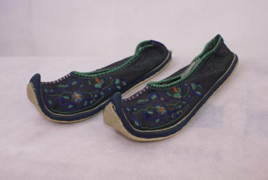 壮族花鞋是壮族的刺绣工艺之一,又称“绣鞋”,为妇女所用,流行于广西龙州等地。鞋头有钩,象龙船。分有后跟和无后跟两种。鞋底较厚。针法有齐针、拖针、混针、盘针、堆绣、压绣等。在色彩上,年轻人喜用亮底起白花,常用石榴红、深红、青黄、绿等艳丽色,纹样有龙凤、双狮滚球、蝶花、雀等;老年人多用黑色、浅红、深红等厚色,纹样有云、龙、天地、狮兽等。