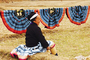 晾晒盛景。白裤瑶女人衣上的神秘之蓝,就是这样经过蜡染晾晒而成的