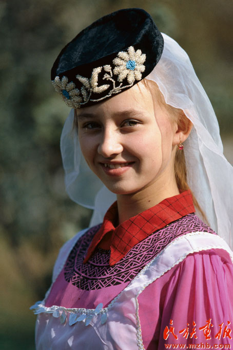 头戴白色纱巾的塔塔尔族女孩