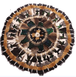 这张拼毯使用了驯鹿、貂熊、紫貂、黄鼬等多种兽皮毛,整体呈放射状向外延展,构图嵌色五彩斑斓,品质十分精美。为了制作这张拼毯,老人花了整整5年时间收集兽皮。仅野鸭头颈部的一小块孔雀绿羽毛,她就收集了近40块,成为了整块拼毯的亮点。