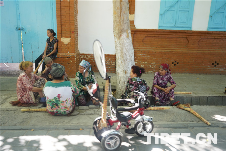 走在喀赞其街头,可以看到穿着鲜艳花色连衣裙的维吾尔族妇女、扎着漂亮方形头巾的哈萨克族姑娘、戴着白色圆帽的回族老汉……如同观看一场民族服装表演。图为喀赞其老街上的“悠闲时光”。