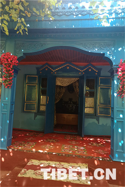 除了古老的纯木质结构民宿,喀赞其还有各式砖石结构的民居。院落宽敞明亮、华丽气派,家家种植着花草、蔬菜,郁郁葱葱、生机盎然,葡萄廊架已成为每家的“标配”,葡萄架下是家人休闲、朋友聚会的地方。图为当地民居院内。