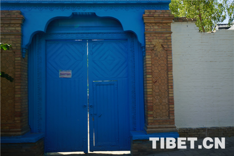 目前,喀赞其仍保留着一定数量的文物古迹,包括自治区级文物保护单位1个(陕西回族大寺),市级文物保护单位7个,另有12处清真寺建筑。图为具有当地特色的临街蓝色大门。