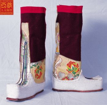 西藏高原地域辽阔,每个地区都有属于自己的鞋子。藏族男女鞋,外观虽然很像舞台上古装戏里穿的靴子,但用牛皮做底,底高二寸,腰高至小腿之上,鞋面用红绿相间的毛呢装饰,鞋腰也有线条、花纹,鞋帮用各色丝线或各色皮革、氆氇、金丝缎制成。人们能从一个人所穿的鞋子判断出一个人的职业和社会阶层。
