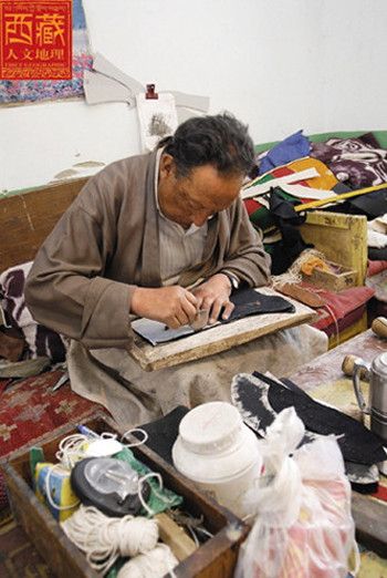 坐在工作台上的赤列塔青,身材高大,穿一身合体的浅色藏装,前摆上沾着几星鼻烟,长期用针的手指有些变形。翻开他的履历发现,赤列塔青可以说是拉萨少有的制靴世家,他的父亲边巴顿珠在旧社会是个给人支差的贫苦鞋匠,靠给有钱人修鞋、做鞋为生。今年68岁的赤列塔青性格沉稳、做事稳健,他12岁当学徒工,做鞋做了56年,如果再加上父辈的修鞋历史,时间更长。在今天的拉萨有这样经历的人算是屈指可数了。赤列塔青从小就在父亲和师傅身边打下手,逐渐掌握这个足以养家糊口的一技之长,终于成长为一个勤奋而多才的手工艺人,开始了稳坐一隅的匠人生涯。