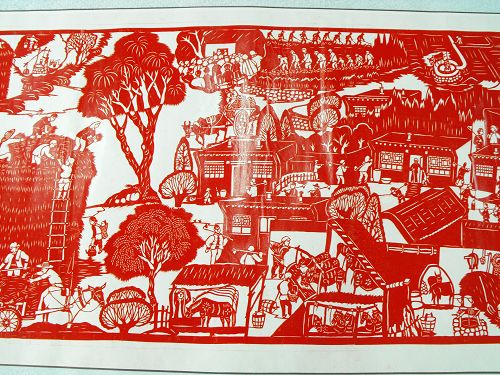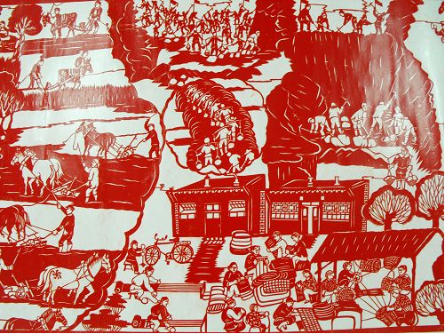 2、达拉特纪事剪纸的历史价值很高,《农民纪事图》上卷记载了从建国到现在农村的发展变化,在作品中我们看到了很多濒临失传的农村生产生活工具和生产方法,也能看到党和国家在每一年出台的各项惠农利民政策,对于研究历史具有重大的文献价值。