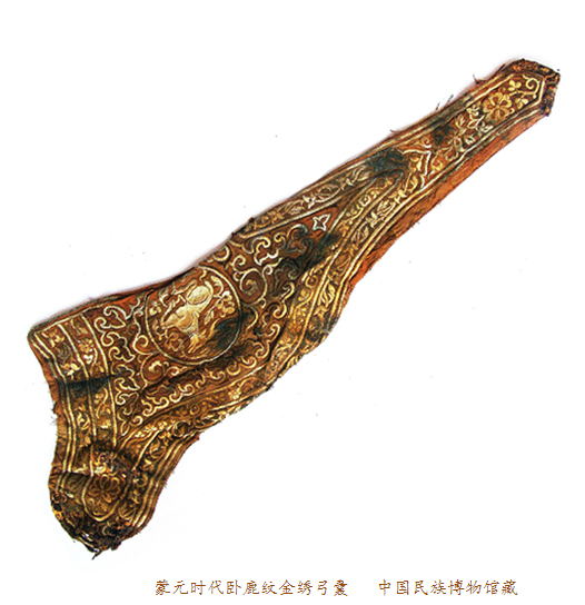 中国民族博物馆馆藏的卧鹿纹金绣弓囊通长72CM,最宽处25CM,最窄处6.5CM。面料为绢地,呈深褐色。专家推断其入土前应内衬桦树皮或兽皮类框架。弓囊正面以银裹金钱绣满图案,整体金碧辉煌。由于埋藏地下数百年,弓囊两端的铁质穿环和皮条已锈蚀腐烂。