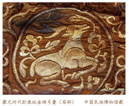 如果说在回回织工梭下的纳石夫图案总是带有浓郁的伊斯兰风情,而我们在这只金绣撒袋上见到的卧鹿纹,则已是纯粹中国特色的春水题材了。它是出自一位已经深受中华文化濡染的回回绣女之手?还是一位已是织金高手的中原绣娘穿针引线完成了它?不论怎样,在文化大交流、民族大融合的时代里,这只金绣撒袋显露出中西文化合璧一体的气息。