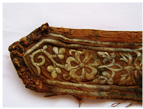 我们曾经描述过元代纳石失生产的空前绝后。蒙古民族把对于黄金的宝爱,倾泄进元朝一百年的历史时空。在整个13世纪的每一个历史篇章,都镌刻着纳石失的金缕光影。我们在史料里看到,天子之衣是纳石失,天子之裳是纳石失,天子之履依然是纳石失。那么,蒙元一代,还有什么是用黄金丝线耗尽心血织绣而成的呢?现在,我们看到了这只金绣弓囊。