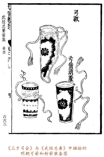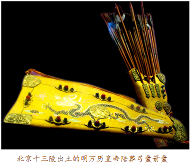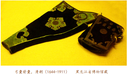 当弓囊出现在眼前时,我们应当想到它的另一半——箭囊。实事上,古代盛装弓箭的器物被称为櫜鞬(gāo jiàn),櫜盛箭,鞬装弓,多以皮革制作。比如明十三陵出土的万历皇帝陪葬品櫜鞬,就用皮革缝制,外敷黄色素缎,金绣龙纹,镶嵌金饰件及各色宝石。一般来说,弓囊为上宽下窄的袋形,箭囊则为长方形。在蒙古语中,弓囊与箭囊合称为“撒答”。因为“答”与“袋”读音相近,所以元代的汉族作家便在作品中将之写为“撒袋”。这样,“撒袋”一词便入了汉语词汇,特指装弓盛箭的袋子。