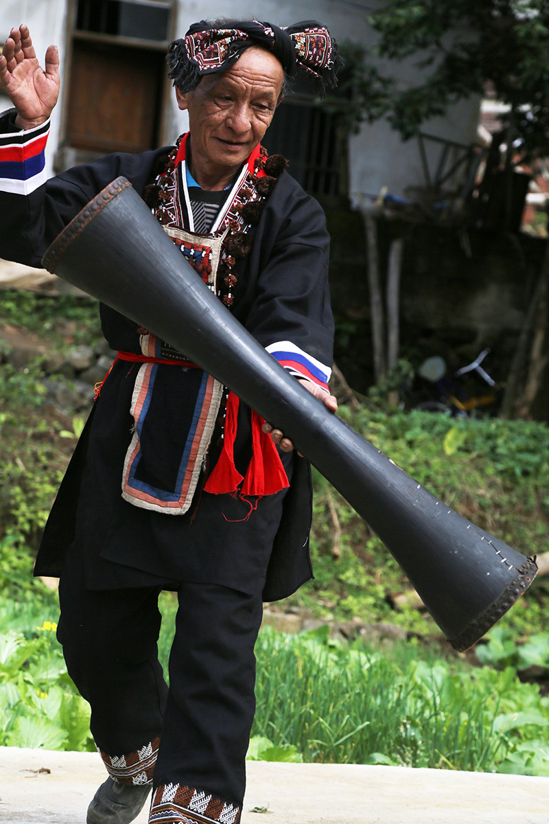 听罢门唻歌,再赏羊角长鼓舞。转鼓、跨步、收腿、回腰、碰角……这套由多人合作的舞蹈,动作粗犷,节奏明快,舞者配合默契,音韵铿锵。今年66岁的老艺人盘福贵,舞起祖宗留下来的已有一百多年历史的羊皮长鼓,身手矫健、动作敏捷,让人惊叹不已。盘福贵的爷爷、父亲都是跳羊角长鼓舞的高手,父亲把这项技艺传授给他,如今他又收女儿和孙子为徒,已是五代传承了。