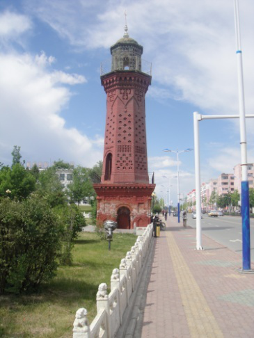 双塔,距红楼不远,是于19世纪末和20世纪初两名乌孜别克族商人捐建的“宣礼塔”。双塔呈铁红色,造型峻拔,塔身上的砖雕,菱形、圆形、六角星图案美感别具风味,圆形琉璃的塔顶,亮如翡翠,通过塔座上的小木门可登上塔顶。这座双塔体现了典型的俄罗斯建筑风格。