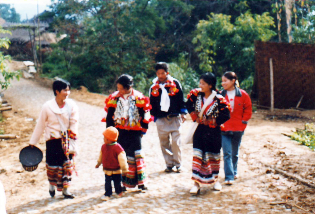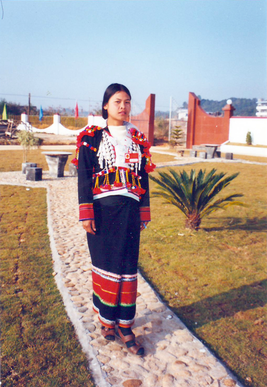 德昂族青年男女结婚前,都要先举行认亲仪式。届时,男方的亲戚如舅父、叔伯等陪同男青年到女方家,用带去的酒肉糖茶等热情地宴请女方家人,并分别赠送礼品给女方家庭成员。认亲过后,女方就请卜卦人选定吉利的日子作为婚期,然后再通知男方家。男方要将彩礼于结婚前送达女方家(图为德昂族女青年,1994)。
