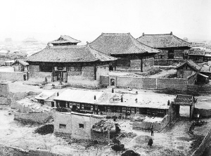 在梁思成拍摄的图片中可以看到:古老的寺院被参差的民居包围,4座嵯峨的殿宇高高矗立在城市的天际线上,建筑魁伟,景色壮观。山门前有一处大院,院内有人还养着牛。远处西北方向可见华严寺薄伽教藏殿和清远门城楼,北面可见城墙上的箭楼和钟楼。