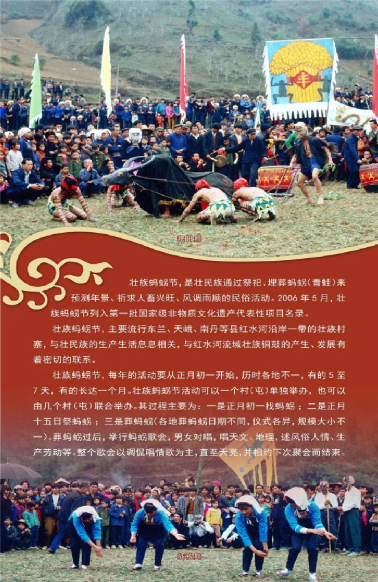 壮族蚂拐节主要流行于广西西北部红水河流域境内,因壮族把青蛙称“蚂”而得名,又称为"蛙婆节"、"青蛙节"。传说掌管风雨的不是龙王,而是蚂女神。红水河沿岸壮族村寨通过祭祀蚂,祈求风调雨顺,五谷丰登,人畜兴旺。所以,每当春节到来之时,这里的壮乡村寨的人们便自发到蚂亭(社亭)周围举行隆重热烈的蚂歌会。