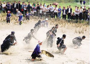 近日,贵州省黔东南苗族侗族自治州黎平县龙额镇龙额侗寨庆祝传统节日“春社节”,当地及周边地区的少数民族同胞欢聚一堂,开展吃“社饭”、捞“社鱼”等民俗活动,祈求风调雨顺。
