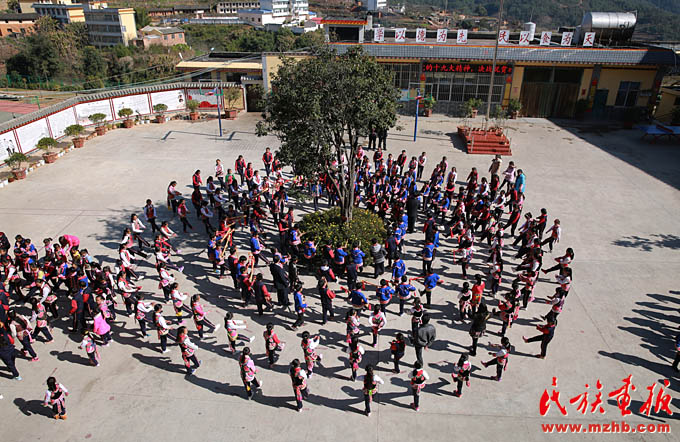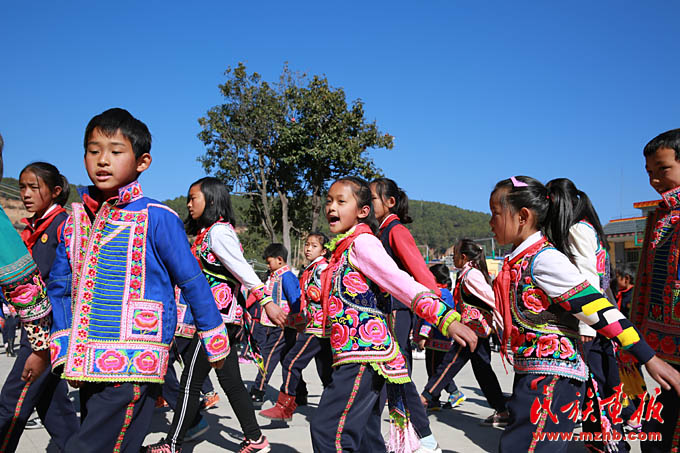 伴随着三弦琴悠扬的旋律和整齐的舞步声,我们走进云南省楚雄市大过口乡中心民族小学校园,映入眼帘的便是身着彝族服装的老师和学生们,他们在操场上围成了三个大圆圈,用彝语和汉语欢快地唱着跳着。进入大圈里,近距离看着手捧三弦琴的高年级同学,还有那些奋力吹着葫芦笙的男同学们,别有一番气势。而那些围成两个小圈的低年级学生们,在阳光下边唱边跳彝族三弦舞,青春的朝气荡漾开来。