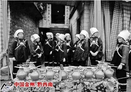 ——礼俗歌。内容丰富多彩,节日或喜庆之日,主客于席上互相吟唱,以抒情怀。以席局《酒歌》为例。可分《问酒歌》、《谢酒歌》、《敬酒歌》等。这些歌,无一不表现出布依族的谦逊、热情、直爽、好客的美德。礼俗歌还包括敬老人歌、赞媳妇歌、进寨歌、出寨歌、宵夜歌等。这些歌无不反映出布依族尊老爱幼的传统美德。特别值得一提的是布依族青年男女经过“浪哨“择爱后,《问媒歌》、《问八字歌》、《说亲歌》、《打亲家歌》等就详尽记述了成亲过程,很有研究价值。接下来还有《接亲歌》、《送亲歌》、《摆酒歌》等描述主客的喜悦心情和结亲的欢乐气氛。