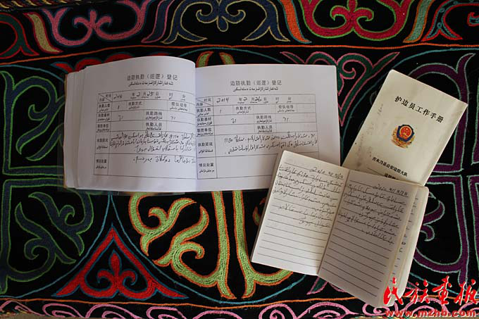 马合沙提 ·斯拉木每天都要记录边防执勤(巡逻)情况(赵利 摄影)
